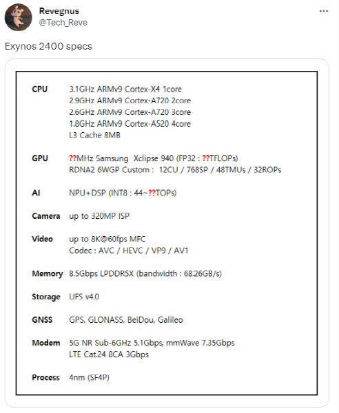 Exynos 2400의 주요 사양에는 1x Cortex-X4 @ 3.19 GHz, 2x Cortex-A720 @ 2.9 GHz, 3x Cortex-A720 @ 2.6 GHz, 4x Cortex-A520 @ 1.95 GHz, Samsung XClipse 940 GPU 및 Exynos 5300의 핵심 구성이 포함됩니다. .(10Gbps) 5G 모뎀이 포함되어 있습니다.