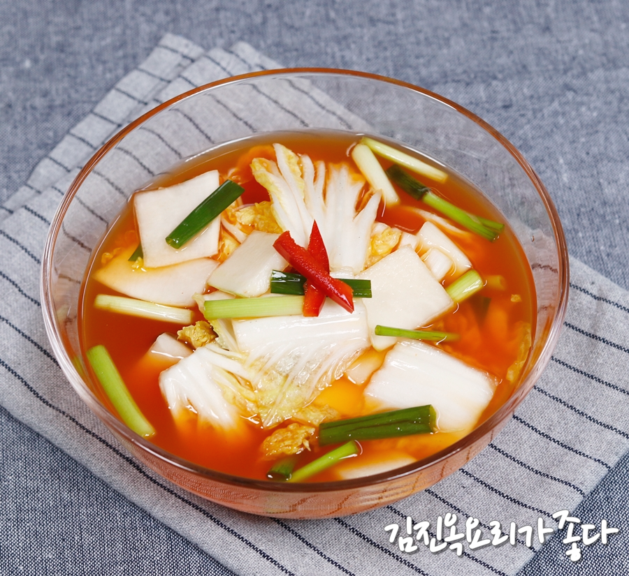 실온에 하룻밤 방치한 후 얇게 썬 단감을 넣었더니 국물이 좀 과하게 익은 것 같아서 냉장고에 넣어두었습니다. 냉장고에 넣어 끓이는 동안 국물이 서서히 재료에 스며들어 시원하게 익어갑니다^^*김치를 만들고 남은 재료가 있다면 꼭 만들어보세요~~!#나박김치, #무배추물김치, # 배추물김치 만들기, #물김치