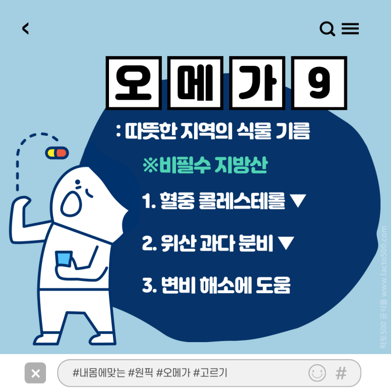 오메가3는 생선뿐만 아니라 식물성 기름에도 함유되어 있어 몸에 유익한 식물성 지방산의 일종이다. 오메가 3의 힘은 많은 유형의 암을 치료하는 데 도움이 되며 유방암이나 암의 위험을 줄이는 것으로 알려져 있습니다. 특히 대장암. 올리브유나 카놀라유에 풍부한 오메가 9는 콜레스테롤 수치를 낮춰주고 과산화물과 변비에 효과가 있다.