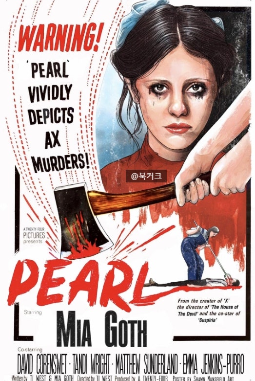 펄 장르: 슬래셔, 호러, 느와르 감독: 타이 웨스트 프로듀서: 제이콥 자프케 각본: 미아 고스 출연: 미아 고스 외 OST: 타일러 베이츠 촬영: 엘리엇 로켓 프로듀서: 리틀 램 배급사: A24 개봉일: 2023년 5월 7일 제작비 : 천만달러 러닝타임 : 102분 시청등급 : 청소년 관람불가