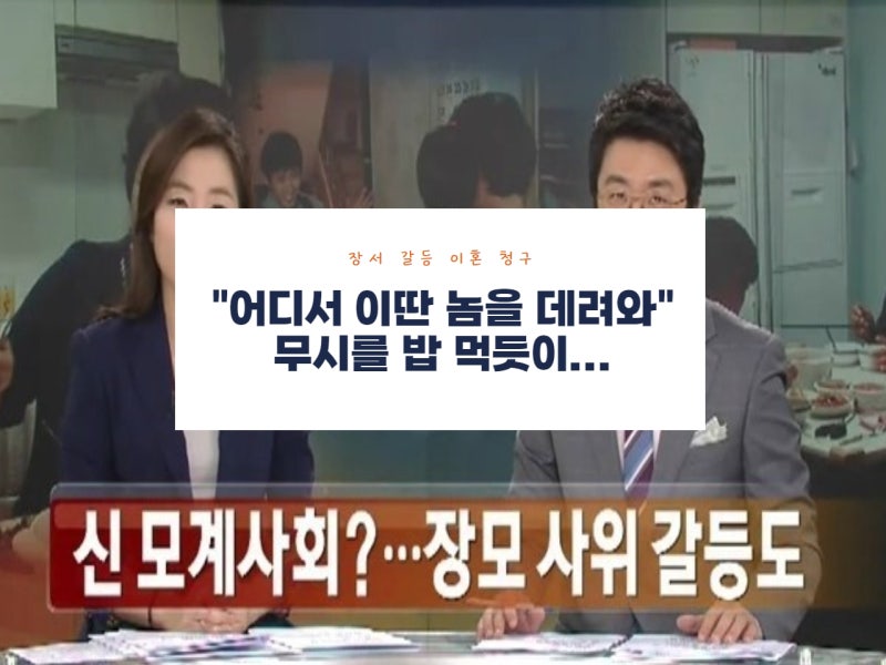 명절이나 긴 연휴가 다가오면 늘 며느리와 시부모의 갈등이 부각되곤 합니다.그런데 요즘은 사위와 장인장모의 갈등도 꽤나 중대한 사회문제로 떠오르고 있는데요.사위는 백년손님이라는 말도 이미 옛말, 요즘은 장인과 장모의 잔소리나 폭언으로 인해 고통받는 사위들이 참 많습니다.고부간의 갈등이 혼인 파탄의 사유가 되는 만큼 장서간의 갈등으로 혼인 파탄을 맞이하는 부부들도 많아지고 있죠.이번에는 장서갈등이혼에 대한 자세한 이야기를 나눠보려고 합니다.