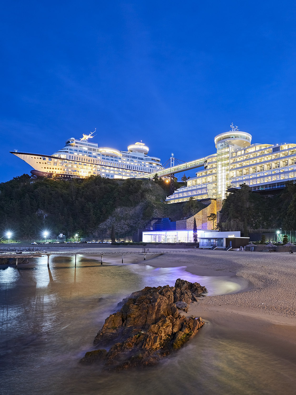 안개가 가득해 몽환적인 느낌을 더해줍니다. 실제로는 웅장하고 크루즈 호텔의 규모도 매우 커서 구경하기가 꽤 좋습니다. 앞 건물은 옛 건물인 ‘썬크루즈 호텔’이며, 내부 통로를 통해 ‘비치크루즈’로 갈 수 있다.