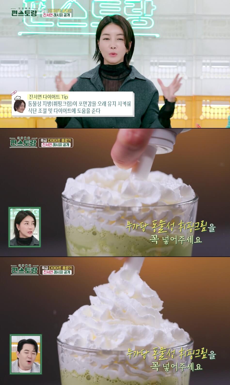 진서연은 편스토랑에 출연해 다이어트 식단에 따라 아침에 일어나 요가를 한 뒤 말차 프라포치노라는 다이어트 음료를 선보였다.