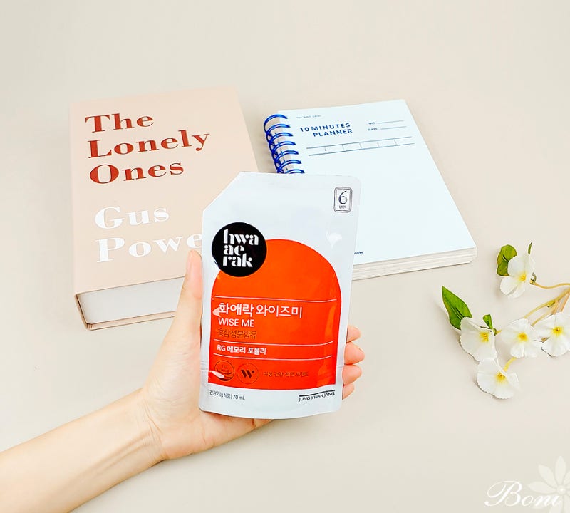 정관장의 기억력 향상에 도움을 줄 수 있는 화애락의 신제품입니다. 얼마 전 남은 화애락 와이즈미 가방을 테이블 위에 올려두었는데 엄마가 보더니 “이거 유명한 제품이지?”라고 하셨어요. 이미 많은 입소문을 타고 있는 브랜드에요!! ㅎㅎ 여성건강으로 유명한 브랜드라고 하셨어요. 건강기능식품이라고 하면 몸에 직접 섭취하는 제품이라 인터넷으로 검색하고 지식이 풍부한 지인들에게 조언을 구한 뒤 제품을 조사하게 되었습니다. 즐겨 먹는 편이에요@!!