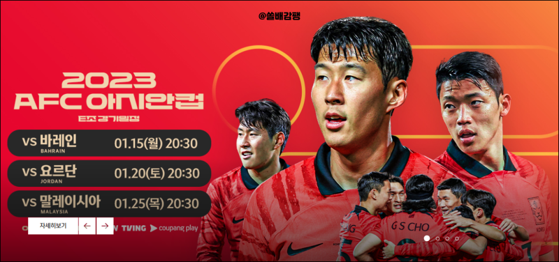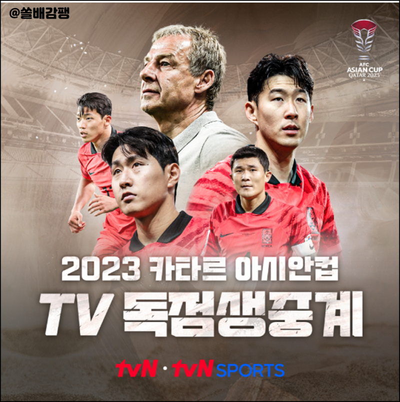 대한축구협회는 1월 2일 2023년 AFC 아시안컵 대표팀 명단을 발표했다. GK: 김승규, 송범근, 현우 JoDF: 김민재, 김영권, 김주성, 지 -김수, 김진수, 김태환, 설영우, 이기제, 정승현MF: 문선민, 박용우, 박진섭, 손흥민, 양 현준, 이강인, 이선민, 이재성, 정우영, 홍현석, 황인범, 황희찬 FW: 이현규, 조규성 As 예상했던 대로 해외 선수들이 많이 포함됐다. 그 중에서도 올 시즌 좋은 활약을 펼치고 있는 조규성, 황희찬, 정우영, 이강인, 손흥민, 설영우가 눈에 띈다. 과연 대표팀 선수들이 64년 만에 아시안컵 트로피를 들어올릴 수 있을지 기대가 쏠린다. . 우리나라에도 이 정도 선수가 있다면 조금 더 기대할 수 있지 않을까? 3. 2023 AFC 아시안컵 결승전 E조 중계